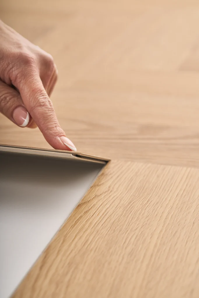 The dismantling pin makes it possible to push the 5G insert back into the groove and unlock the panel. This enables panel-by-panel removal, making it easy to correct mistakes during installation without the risk of damaging the panels. It also supports reuse and reinstallation, enhancing both the circularity and sustainability of the flooring.